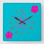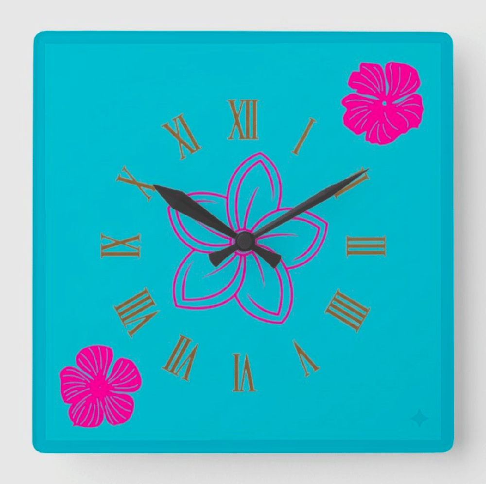 A beautiful teal blue with hot pink flowers and gold colored Roman numerals perfect to liven up any room