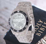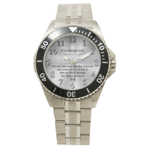 The Men's Stainless Steel Watch is built for adventure. Designed as a nod to classic diver and military watches, it features stainless steel construction, an adjustable bezel, and water resistance to over 300 feet. The face displays a cross and full Bible verse.
