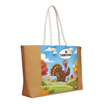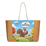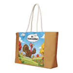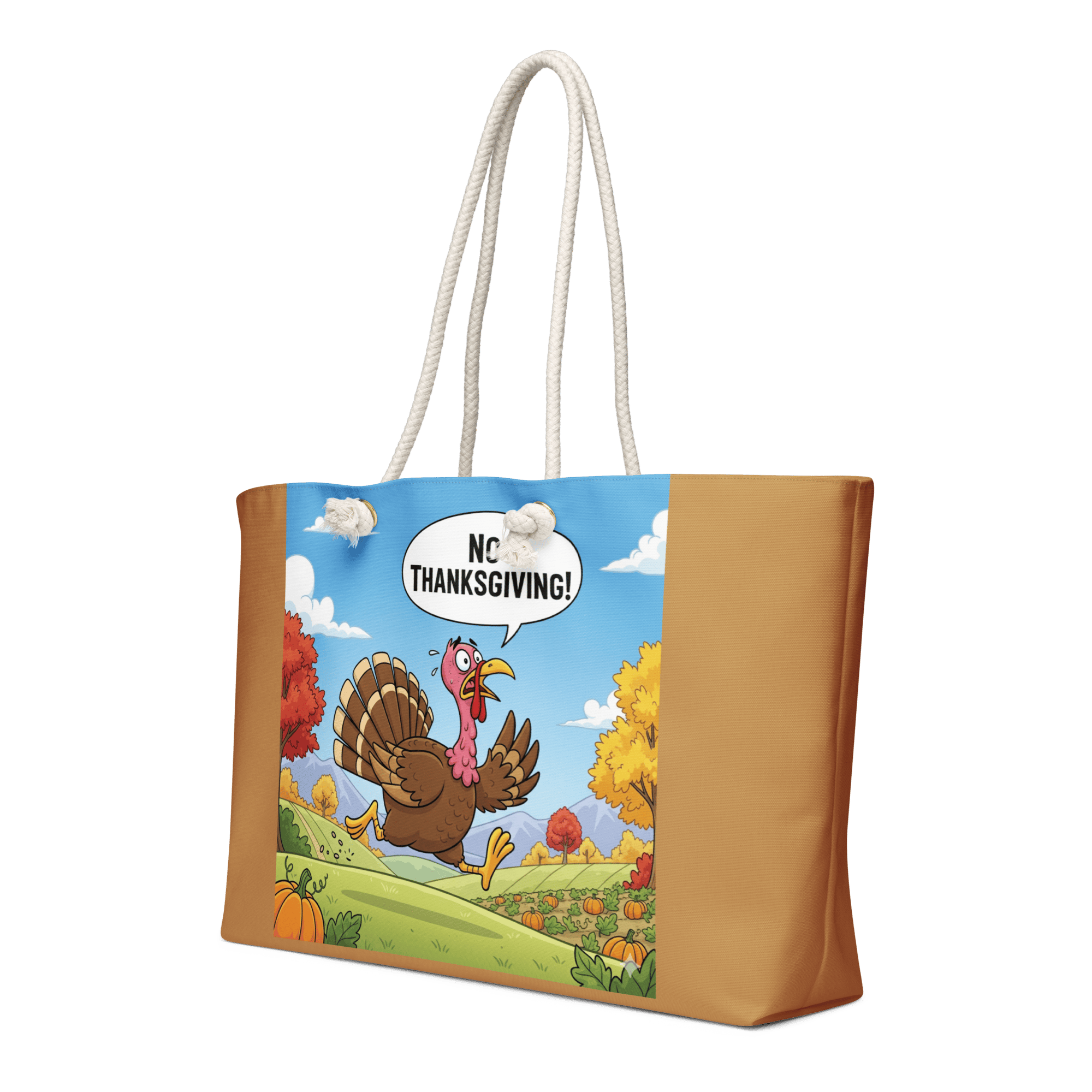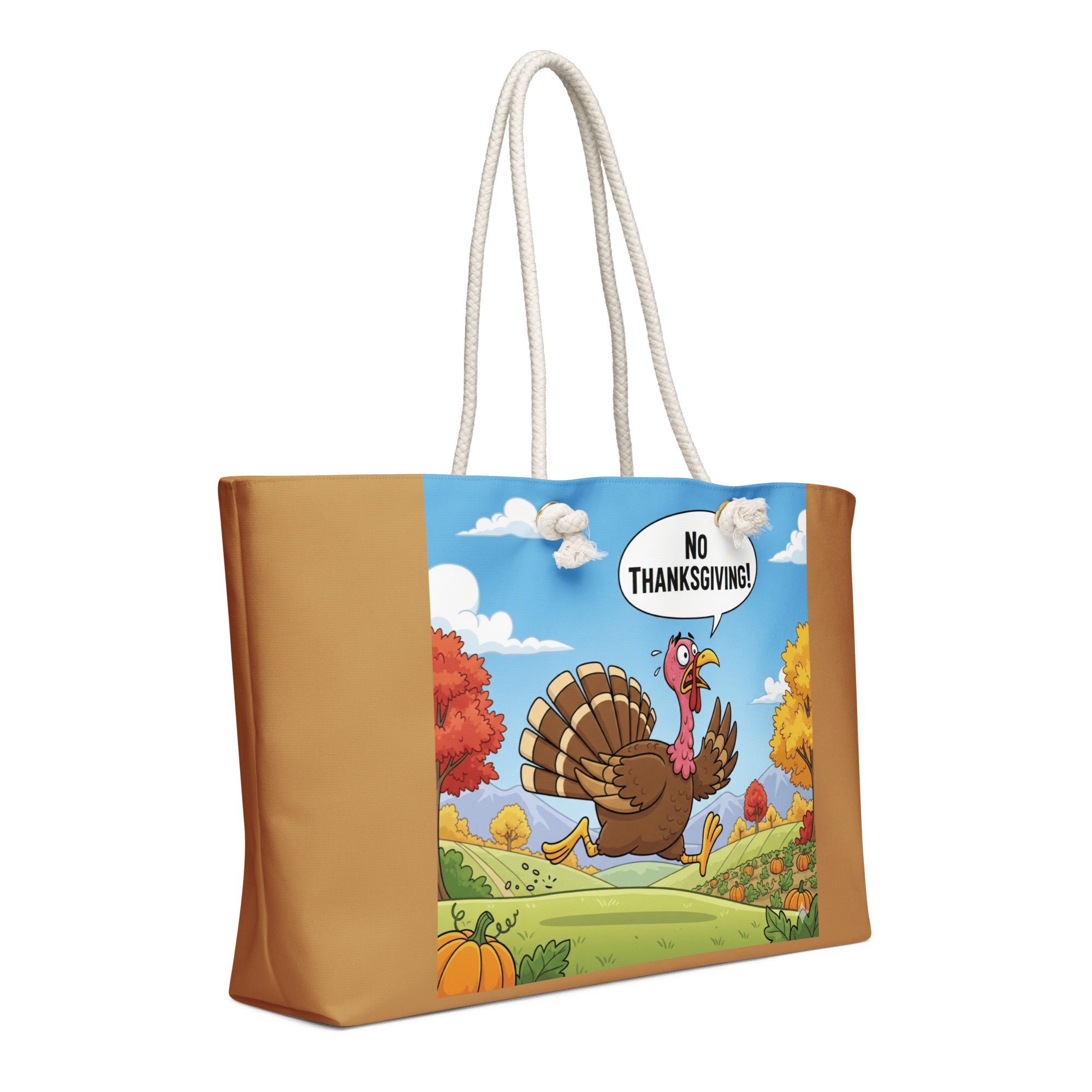 Oversized bag / purse ( cartoon turkey running saying no Thanksgiving) on light brown
