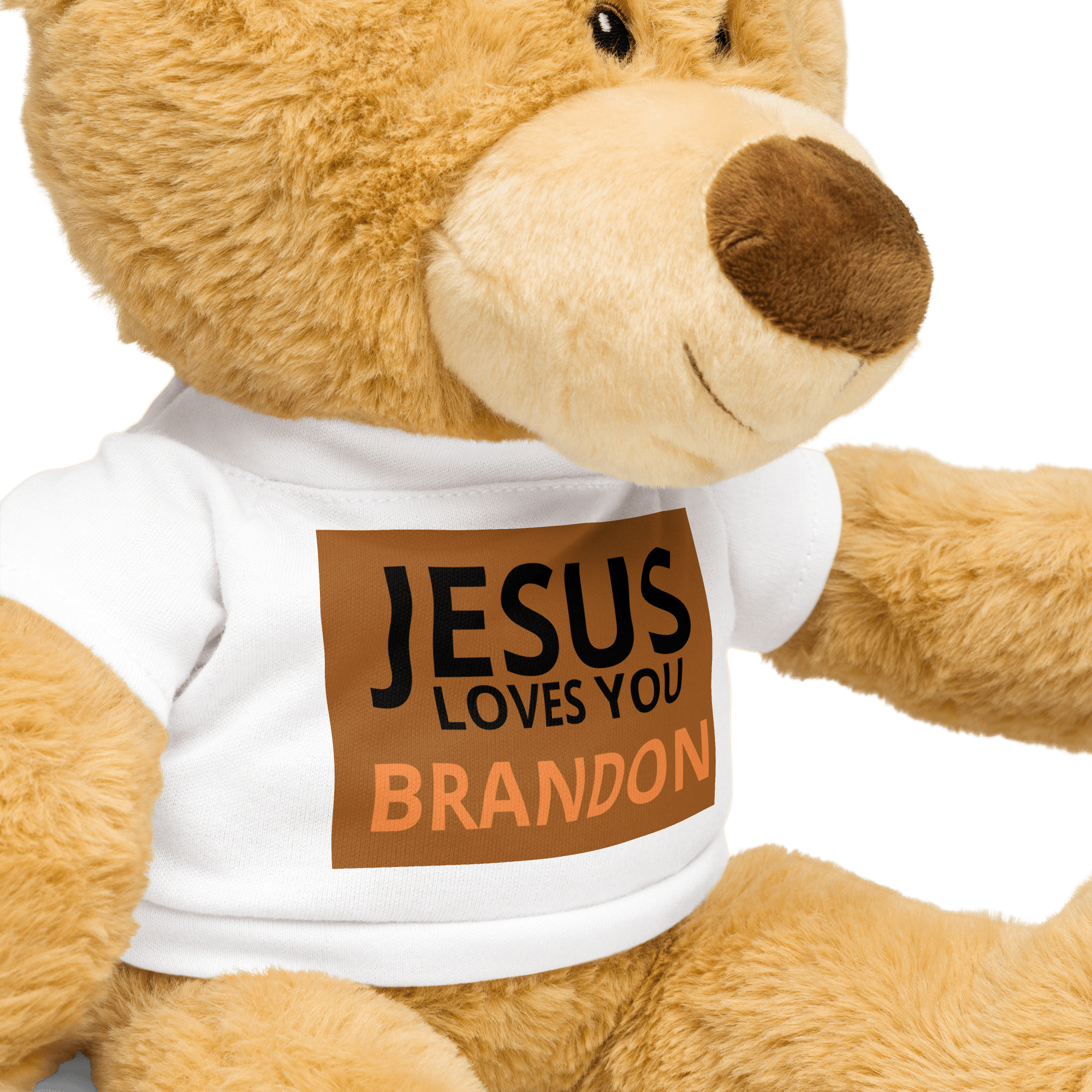 Teddy bear with a t-shirt (Jesus loves you BRANDON)